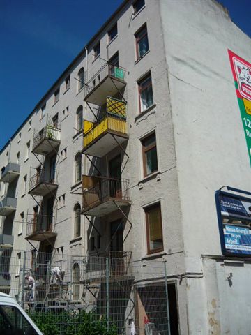 und anstelle der kleinen stark geschädigten Balkone eine elegante auf Stützen ruhende