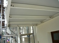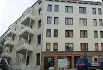Dieses Objekt erhielt an der Straßen- und Rückfront ein Wärmedämmverbundsystem und anstelle der kleinen, starkgeschädigten Balkone eine elegante auf Stützen ruhende Balkonanlage.